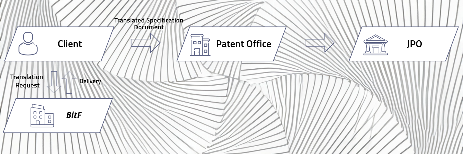 BitF provides a streamlined translation service for patent specifications, working in conjunction with patent offices. Upon receiving a translation request from a patent office, we meticulously translate the English specification documents. After ensuring the quality of our translations, we deliver the documents back to the patent office, which then forwards them to the Japan Patent Office (JPO). This indirect service model ensures precise and efficient handling of patent applications.