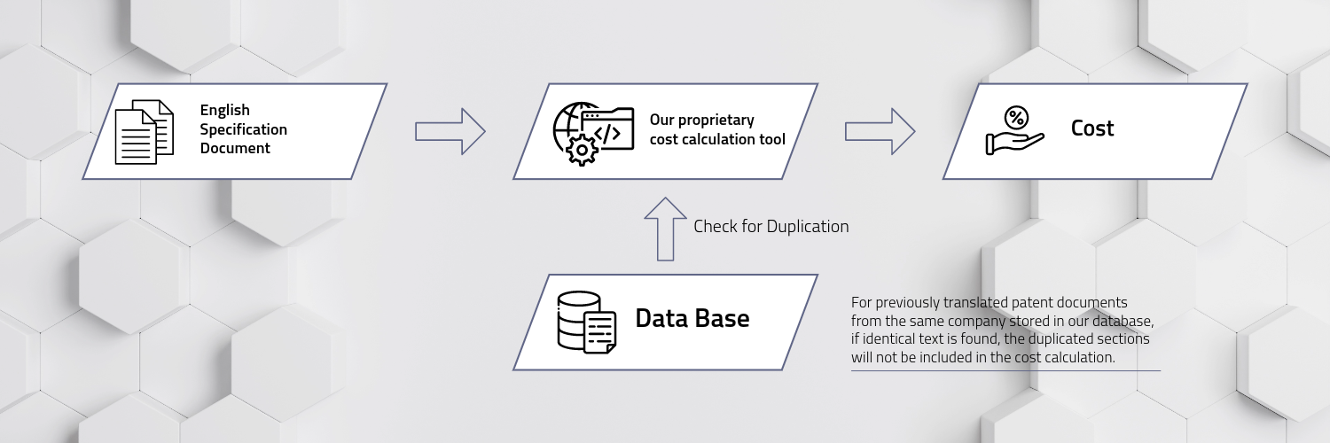 Experience transparency and fairness in pricing with our unique cost calculation process for patent translation services. Starting with the English specification document, we employ our proprietary tool to estimate costs. This tool is designed to identify any duplications by cross-referencing with our extensive database of previously translated documents. If we find identical sections from the same company’s past patents, we exclude these duplicates from the cost calculation. This ensures that you only pay for the original content translation, optimizing your expenses and maintaining the integrity of our pricing.